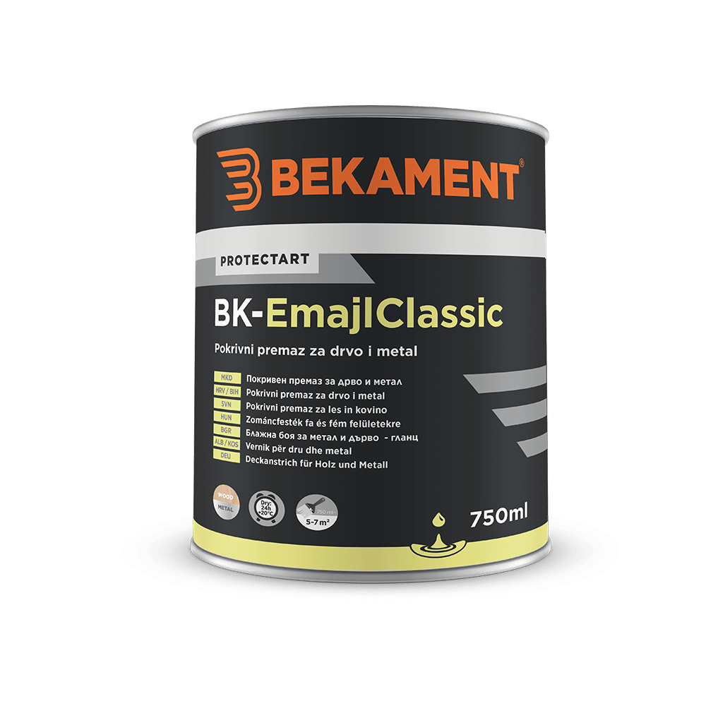 PRIMENA Univerzalni, antikorozivni premaz za dekoraciju i zaštitu metal? i drveta u enterijeru i eksterijeru (gradevinska stolarija, ograde, kapije, metalne konstrukcije). PRIPREMA I NANOŠENJE Podloga mora biti suva, obrušena i ocišcena. Pre upotrebe sadržaj dobro promešati masu, a zatim razrediti uljanim razredivacem BK-Classic maksimalno do 5% (37,5 ml za pakovanje 750 ml). Nanosi se cetkom, valjkom ili špricanjem preko BK-MetalPrime Classic ili preko BK-WoodPrimer Classic u 1-2 sloja. Nanošenje sledeceg sloja nakon 24h. POTROŠNJA Oko 110-143 ml/m2 u jednom sloju. ROK TRAJANJA I SKLADIŠTENJE 36 meseci u originalno zapakovanoj ambalaži. Skladištiti na temperaturi od +5°C do +25°C, zašticeno od sunceve svetlosti i smrzavanja. Datum proizvodnje utisnut na ambalaži. PAKOVANJE 750 ml BOJA Oker