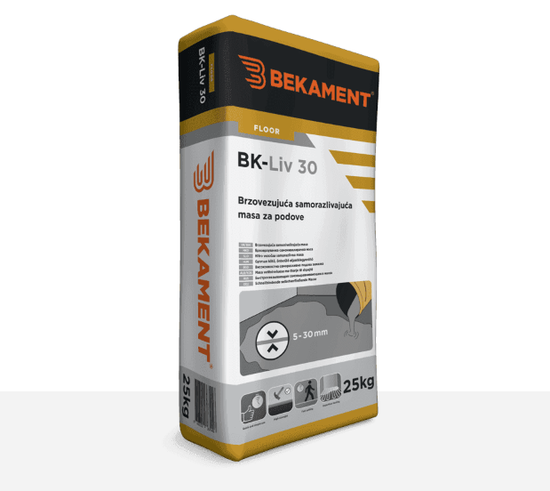 Podloga na koju se masa nanosi mora biti čvrsta, čista, otprašena, bez masnoća i slabo vezanih delova. Pre nanošenja BK-Liv 30 podlogu premazati BK-Ultra Prime-om, dok u slučaju nanošenja na stare keramičke pločice kao podlogu koristiti BK-Bond. Vreme sušenja podloge iznosi min. 4h. Priprema mase se vrši dodavanjem praha u 19-20% vode (oko 5l vode za 25 kg praha), do potpune homogenizacije. Masu ostaviti da odstoji 5 min a zatim ponovo promešati. Masa se razliva na podlogu u jednom sloju koristeći pogodan alat a nakon razlivanja poželjno je površinu prevući specijalnim igličastim valjkom („jež“ valjak), u cilju izbacivanja mehurova vazduha. Samešanu masu upotrebiti u roku od 45 min. Za detaljna uputstva pogledati tehnički list proizvoda.