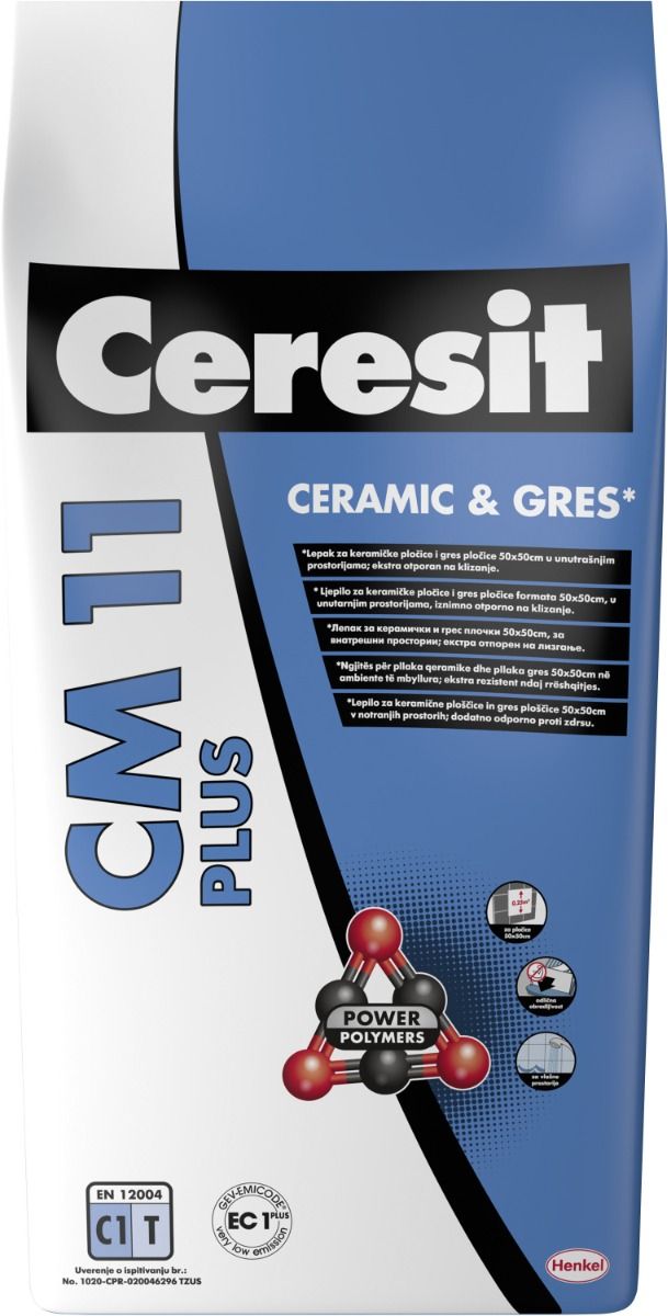 CERESIT® CM 11 je tankoslojni lepak za polaganje keramičkih i gres pločica na upijajućim spoljašnjim i unutrašnjim površinama. Nanosiv na cementne maltere i maltere na bazi cementa i kreča (produžne maltere), cementne košuljice, samonivelišuće mase i beton, vlažne prostorije kao što su kupatila, toaleti, kuhinje, pomoćne prostorije poput podruma, ostava, soba za sušenje, hodnika, stepenica, dnevne sobe.