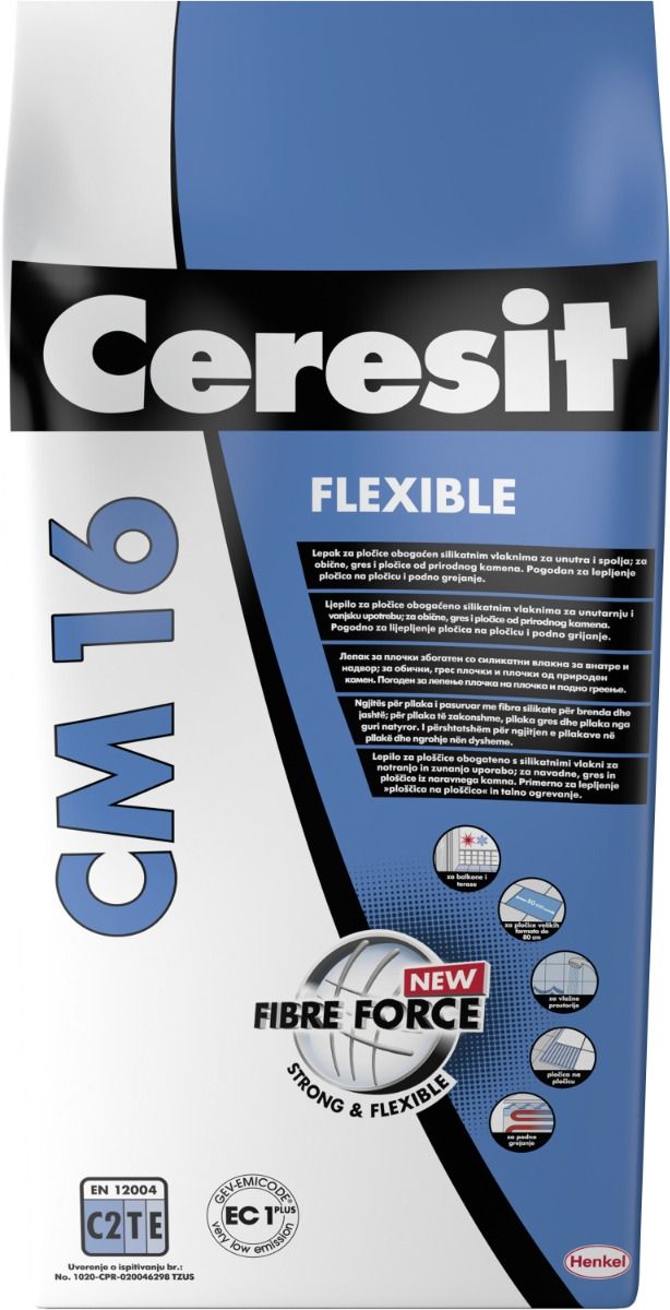 CERESIT® CM 16 je fleksibilni lepak za spoljašnju i unutrašnju upotrebu obogaćen silikatnim vlaknima. Idealan za sistem pločica na pločicu. Pogodan za polaganje gres pločica, prirodnog kamena i sistema podnog grejanja. Svojstva lepka omogućavaju postavljanje pločica na gipsanim tablama, sistemima za podno grejanje, suvim košuljicama, gipsu, zasićenom betonu i vodonepropusnim slojevima. Primenljiv je u vlažnim prostorima.
