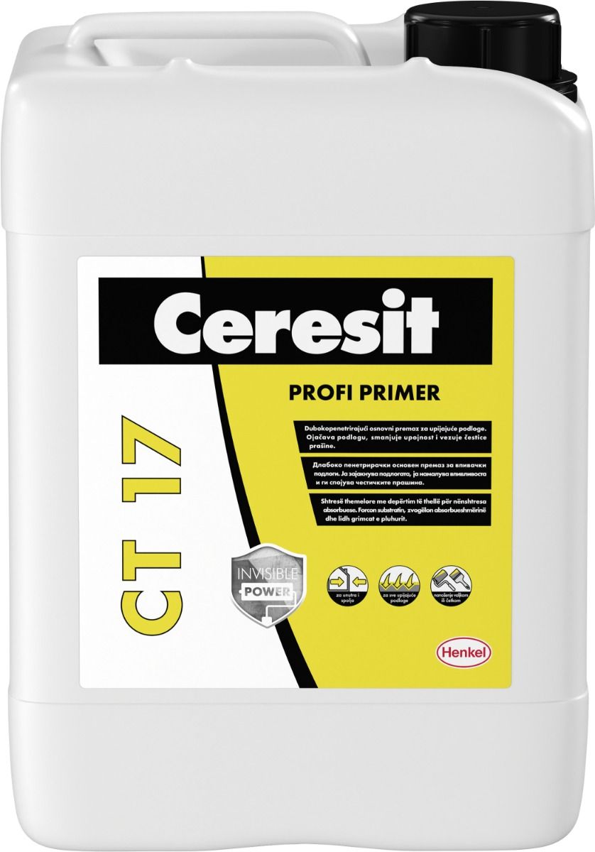 CERESIT® CT 17 je osnovni zidni i podni premaz za vezivanje slabo vezanih čestica prašine i povećanje vodoodbojnosti glet mase, gips-karton ploča i vlaknastih ploča, anhidrit podloga, visoko apsorbujućih maltera ili cementnih podloga, prirodnih ili veštačkih podova kao i betonskih podloga. Primenljiv unutrašnjim i spoljašnjim prostorima sa fokusom na lepljenje tapeta, nanošenje glet masa, boja, ili montažu termoizolacije, kao i na lepljenje keramičkih pločica i izlivanje podova.