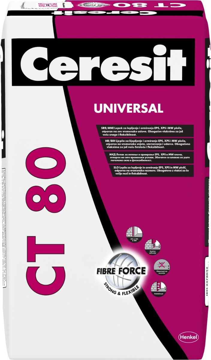 CERESIT® CT 80 je lepak za lepljenje i rabiciranje fasadne mineralne vune obogaćen vlaknima. Može se koristiti prilikom izolacije novih objekata i kod energetske sanacije postojećih objekata. Takođe, može se koristiti kod lamelnih tabli za izolaciju plafona garaža. Dostupno pakovanje: Džak od 25 kg.