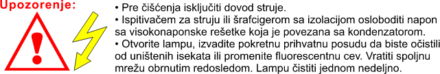 NAPOMENE: Obratite pažnju da ne bude vode na visokonaponskoj rešetki. Lampa je isključivo namenjena za upotrebu u zatvorenim prostorijama i ne sme se koristiti u spoljnim uslovima, kao ni u štalama, ambarima i sličnim lokacijama. Nije predviđeno da ovaj proizvod koriste deca, osobe sa umanjenim fizičkim, senzornim ili psihičkim sposobnostima. Ne ostavljati uključen proizvod bez nadzora. Ukoliko duže vreme ne koristite proizvod, isključite iz struje. Ne dodirujte metalnim predmetima visokonaponsku rešetku. Ukoliko primetite bilokakvu nepravilnost u toku rada, odmah isključite uređaj i obratite se stručnom licu.