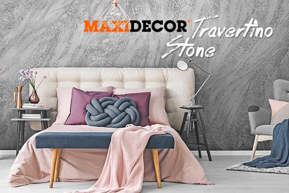 Tehnika nanošenja: MAXIDECOR Travertino naneti u ujednačenom sloju nerđajućom gletericom tako da debljina nanetog materijala bude približno 1,5–2,0 mm. Nakon nanošenja, posle približno 10–15 minuta (u zavisnosti od vremenskih prilika), odnosno čim materijal počne da se suši, pristupiti kreiranju teksture odgovarajućim alatom (npr. alat sa veštačkom travom) kako bi se formirale „žilice“ koje su svojstvene travertin prirodnom kamenu, čijoj imitaciji treba težiti. Nakon toga, nerđajućom gletericom, nešto većim pritiskom izravnati površinu tako da se kreira tekstura prirodnog kamena. Kada je postupak nanošenja gotov, pristupiti „sečenju“ nanetog materijala, kako bi se napravila imitacija blokova kamena. Materijal „seći“ upotrebom zaobljenog čoška manje špatule ili upotrebom odvijača (šrafcigera) praveći blokove odgovarajućih dimenzija. Kako bi linije bile potpuno horizontalne, odnosno vertikalne, koristiti dugacku libelu kao vođicu. Posle upotrebe, alat odmah oprati vodom.