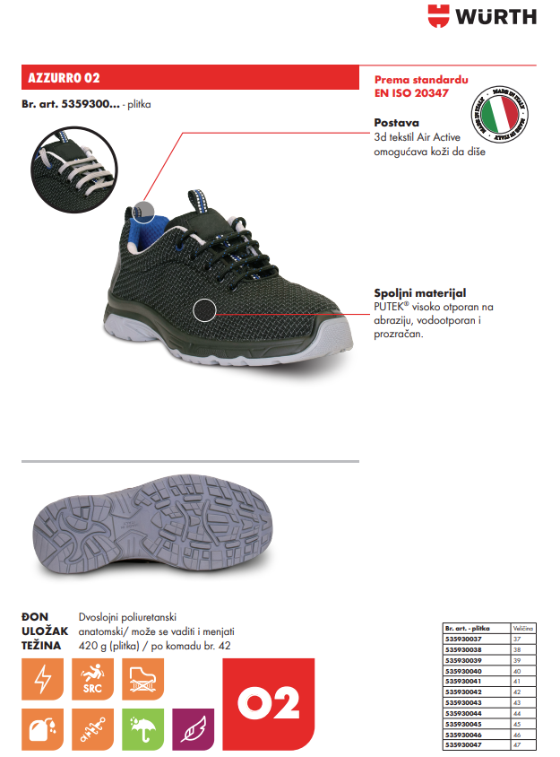 AZZURRO radne patike O2 nivoa zaštite, bez zaštitne kape i međuđona, napravljene od PUTEK materijala koji je izuzetno izdržljiv, otporan na abraziju, veoma lagan, prozračan i vodoodbojan.