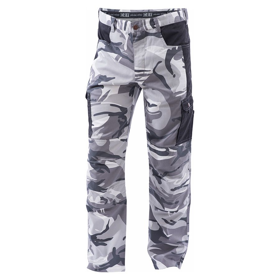 CRAMBE pantalone  Muške maskirne pantalone, modernog dizajna, proizvedene od kombinacije materijala 65% poliester i 35% pamuk, 190 g/m2. Imaju ojačanja na kolenima za povećanu otpornost na habanje. Poseduju praktične džepove – dva zadnja, dva bočna za ruke i dva sa strane na nogavicama. Lagane i prijatne za nošenje u toplijim vremenskim uslovima. Dostupne su u tri nijanse maskirnog dezena – standardnoj, sivoj i bež.    Veličina S-3XL