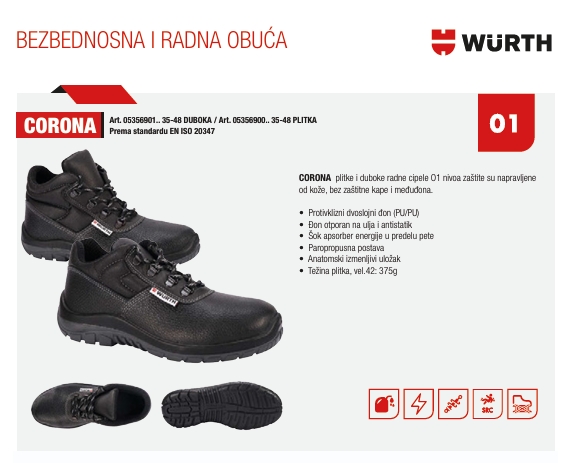 CORONA duboke radne cipele O1 nivoa zaštite su napravljene od kože, bez zaštitne kape i međuđona.
